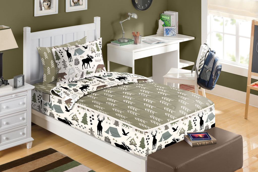 Grab your trusty compass, your biggest flashlight and pack up your camping gear ‘cause you're about to embark on an exciting journey into the woods, where Adventure Awaits! Shhh! Are those bear tracks you see, or just deer? Time to set up a campfire, break out the s'mores and listen to the owls say “Hoo! Hoo!" as you unzip your one-of-a-kind Zipit Bedding set. Get ready to drift off to dreamland, under a blanket of stars. Then, unzip the comforter to reveal a warm, rustic-style coordinating print that will have you feeling like your sleeping in the woods.