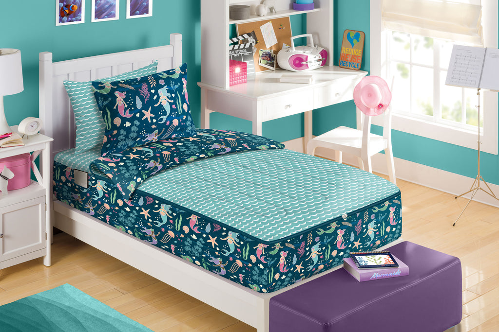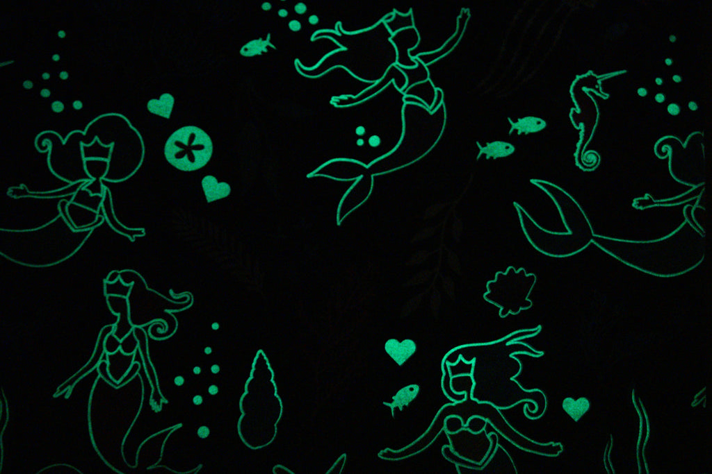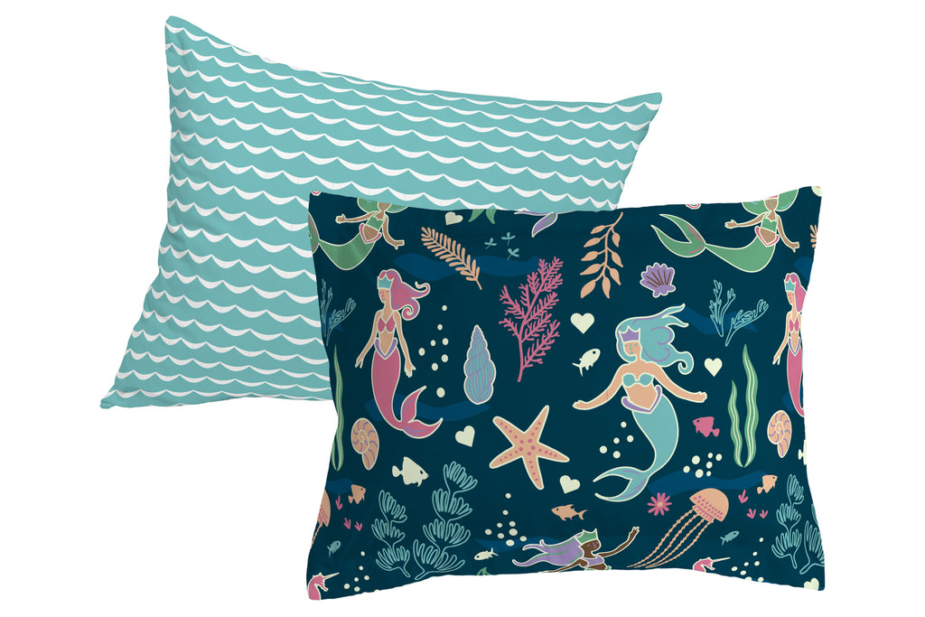 Shut off the lights and dive deep into this Enchanted Under the Sea glow-in-the-dark Zipit Bedding set. Once there, you'll discover a magical world where mermaid princesses, surrounded by stunning seashells, play with unicorn seahorses and friendly jellyfish. Then, unzip your bedding to reveal a tranquil wave print that will have you swimming off to an oceanic dreamland in style.