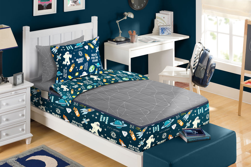 Fasten your seatbelts, put on your space suits and get ready for takeoff when you journey into the unknown with this truly out-of-this-world glow-in-the-dark Space Explorer Zipit Bedding set. Your one-of-a-kind zippered bedding set will transport you to a place where brave astronauts, curious space aliens, speedy rocketships and magical solar systems unite. Then, unzip your bedding to reveal a fun and coordinating mid-century modern constellation print.